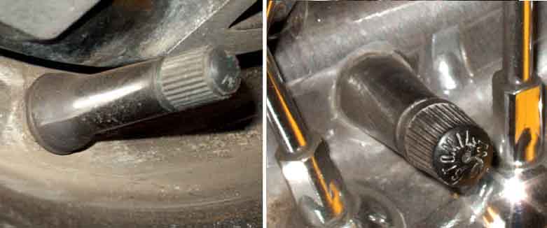Tubeless valve in a Rostyle wheel on the left clearly with a 'mushroom' seal against the face of the rim. Tube valve in a wire wheel on the right with straight sides going through the hole in the rim i.e. no seal.