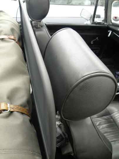 A neighbour had given me some aluminium sheet many years ago - her husband had been in the car industry in design even further back and this was some 3/16" thick stuff he had used for chassis and body frames, it was the ideal thickness for a snug fit in the tonneau sockets. I cut and shaped a pair of brackets that plugged in the sockets and more-or-less followed the line of the folded hood frame behind the seats nearly to the horizontal line of the tonneau cover over the folded hood. These ended in a vertical post about 10 1/2" high that was going to be the support for the fabric. I say 'vertical' but they are inclined in towards the centre of the car to follow the line of the screen side rails when viewed from the rear as the adjacent pics.
