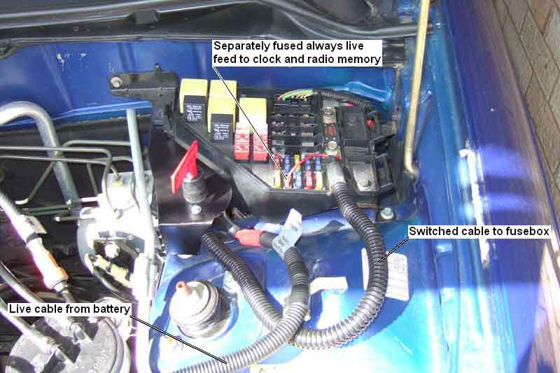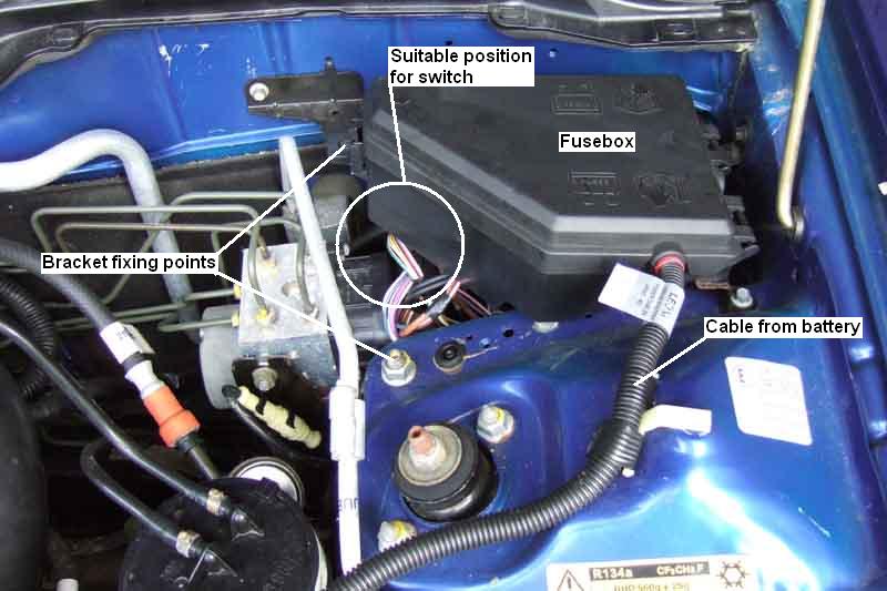 Suitable location for the switch, giving enough clearance to the bonnet as well as allowing the existing cable from the battery to be swung round from the fusebox to the cut-off switch, and the installation of a new ready-made link cable from the switch back to the fusebox.